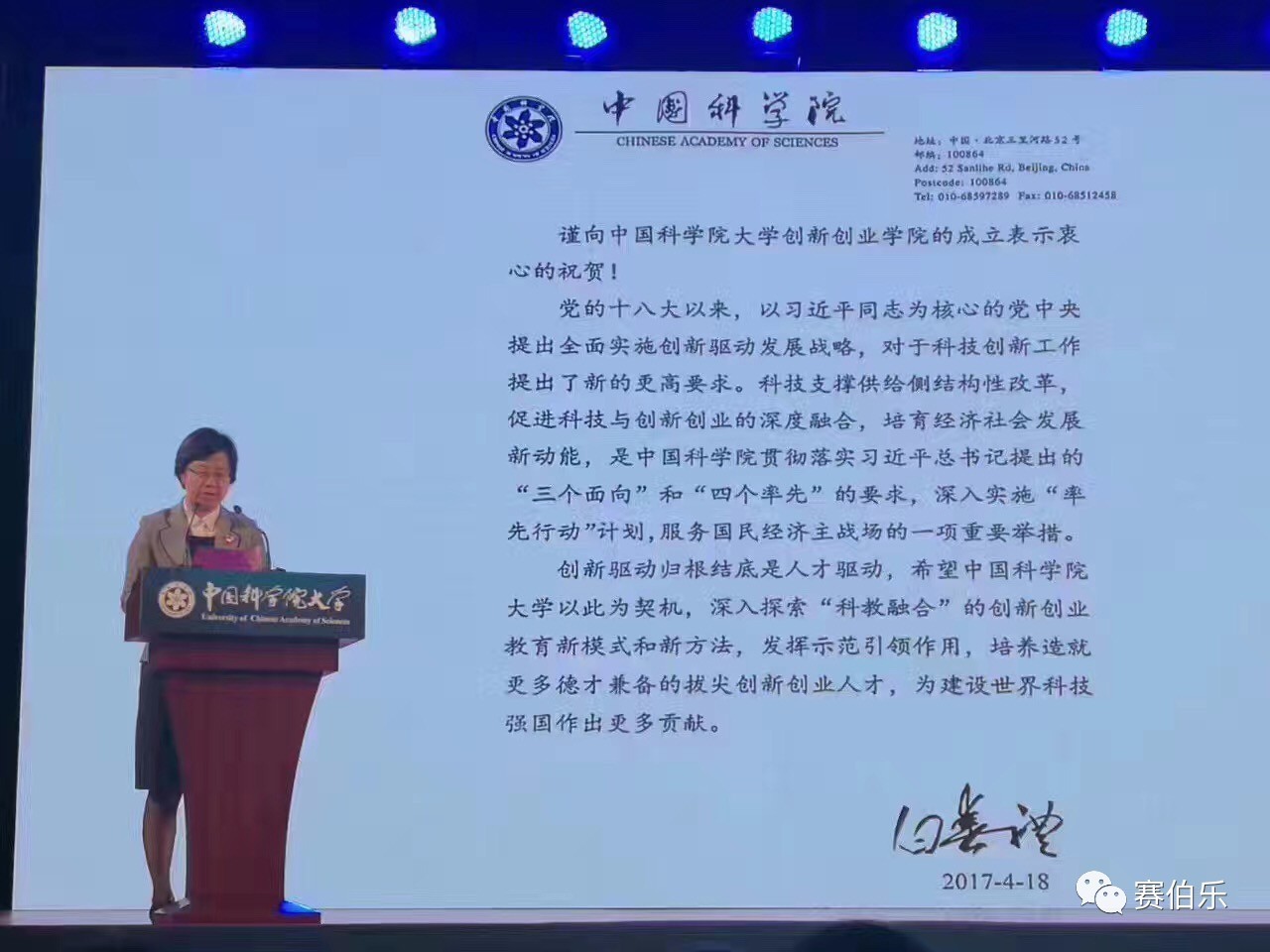 2017年4月18日上午,賽伯樂投資集團、三盛宏業(yè)投資集團、中興通集團與中國科學院大學共建的創(chuàng)新創(chuàng)業(yè)學院成立大會在國科大玉泉路校區(qū)禮堂舉行。