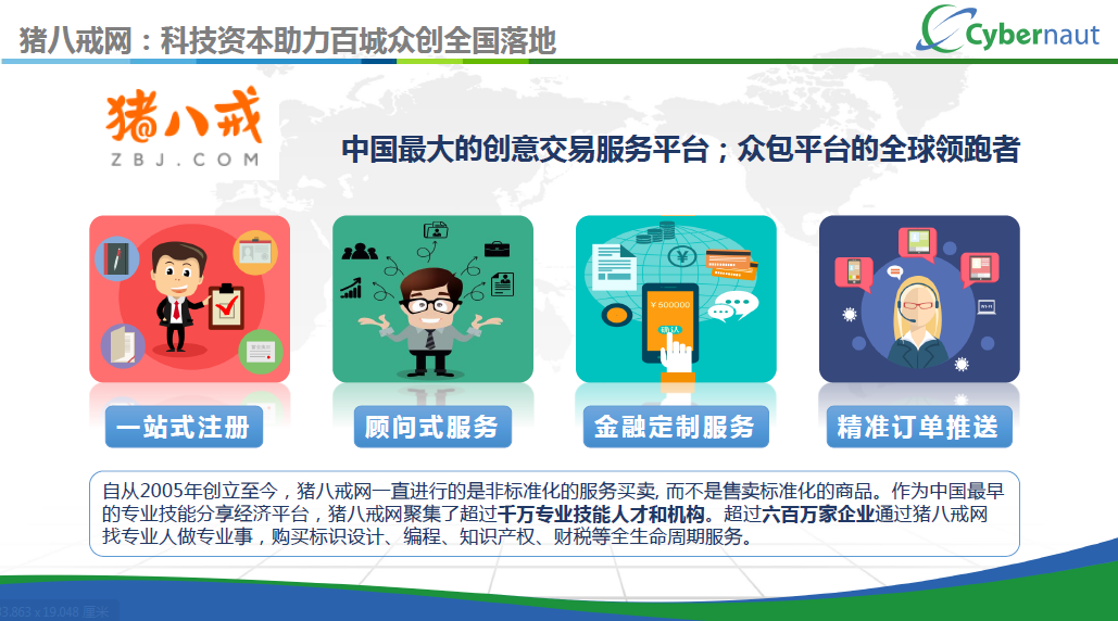 ? 在11年的企業(yè)實(shí)踐中,豬八戒網(wǎng)已經(jīng)成為中國(guó)最大的服務(wù)類(lèi)電子商務(wù)交易平臺(tái),也是全國(guó)唯一的中小微企業(yè)全產(chǎn)業(yè)鏈平臺(tái)。2015年賽伯樂(lè)出資16億投資豬八戒網(wǎng),重慶市政府跟投10億,總計(jì)26億注資豬八戒網(wǎng)打造全國(guó)最大雙創(chuàng)服務(wù)平臺(tái), 同時(shí)在2016年結(jié)合賽伯樂(lè)“百城雙創(chuàng)”眾創(chuàng)大廈全部布局戰(zhàn)略,同豬八戒網(wǎng)一起在全國(guó)進(jìn)行落地。