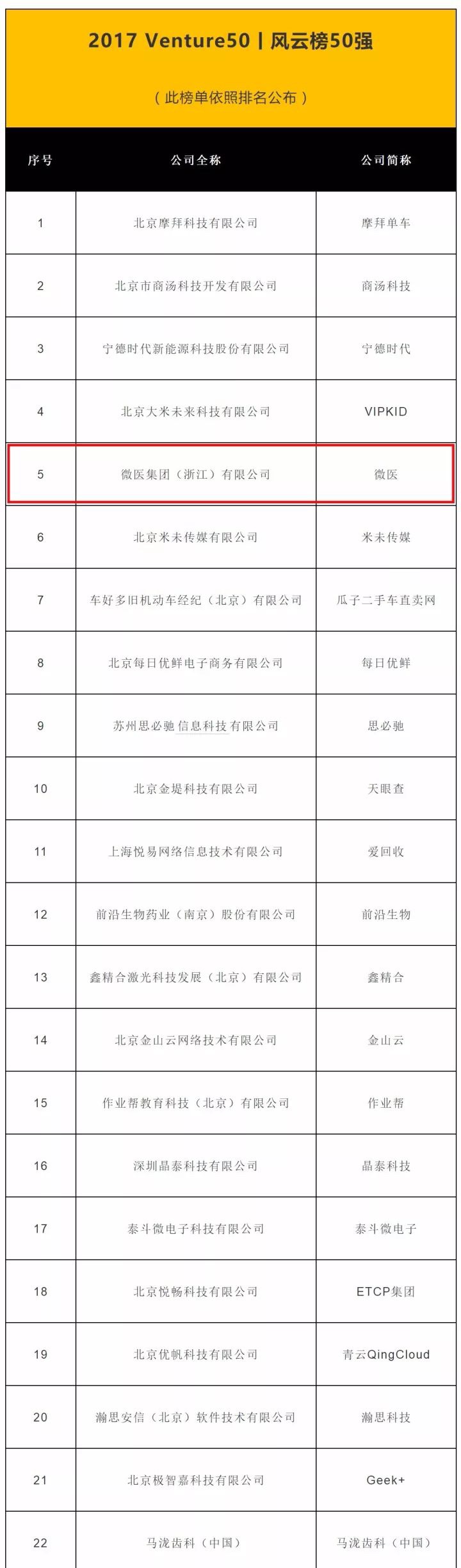 ? 10月26日,第12屆清科集團“2017中國最具投資價值企業(yè)50強”名單在京隆重發(fā)布,通過對企業(yè)模式、規(guī)模、團隊、營收、形象等多個維度的層層篩查,最終賽伯樂投資的微醫(yī)與摩拜單車、商湯科技、寧德時代、VIPKID躋身前五名,微醫(yī)是智能醫(yī)療領域唯一入選企業(yè)。