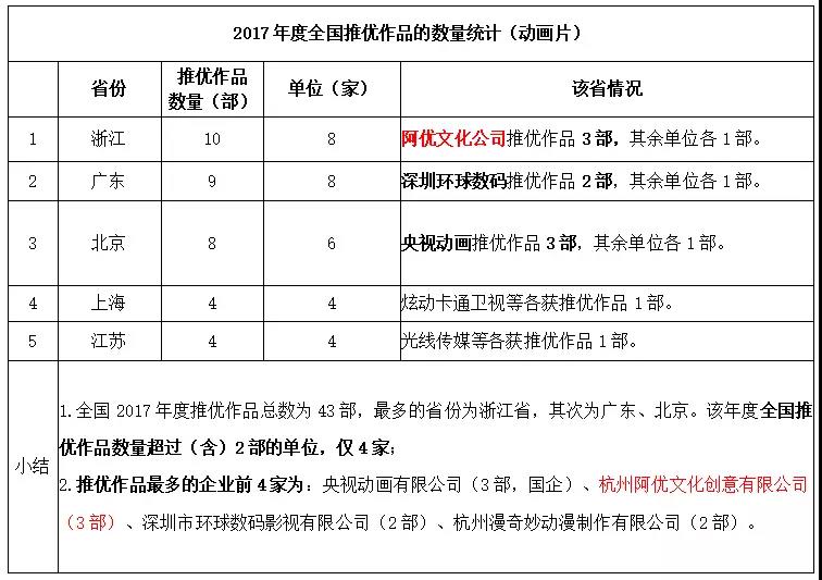 據(jù)統(tǒng)計(jì),2017年度全國(guó)推優(yōu)作品總數(shù)為43部,擁有超過(guò)(含)2部的單位僅4家,擁有超過(guò)(含)3部的單位僅2家。浙江省成為獲得推優(yōu)作品數(shù)量最多的省份,而阿優(yōu)文化公司占了其中的30%。同時(shí),阿優(yōu)文化公司也是2017年度全國(guó)獲得推優(yōu)作品最多的民營(yíng)動(dòng)漫企業(yè)。
