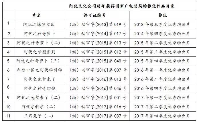 截至2017年,阿優(yōu)文化公司擁有11部作品被評(píng)為國(guó)家廣電總局的推優(yōu)作品,占公司總播放作品總量(13部)的85%。